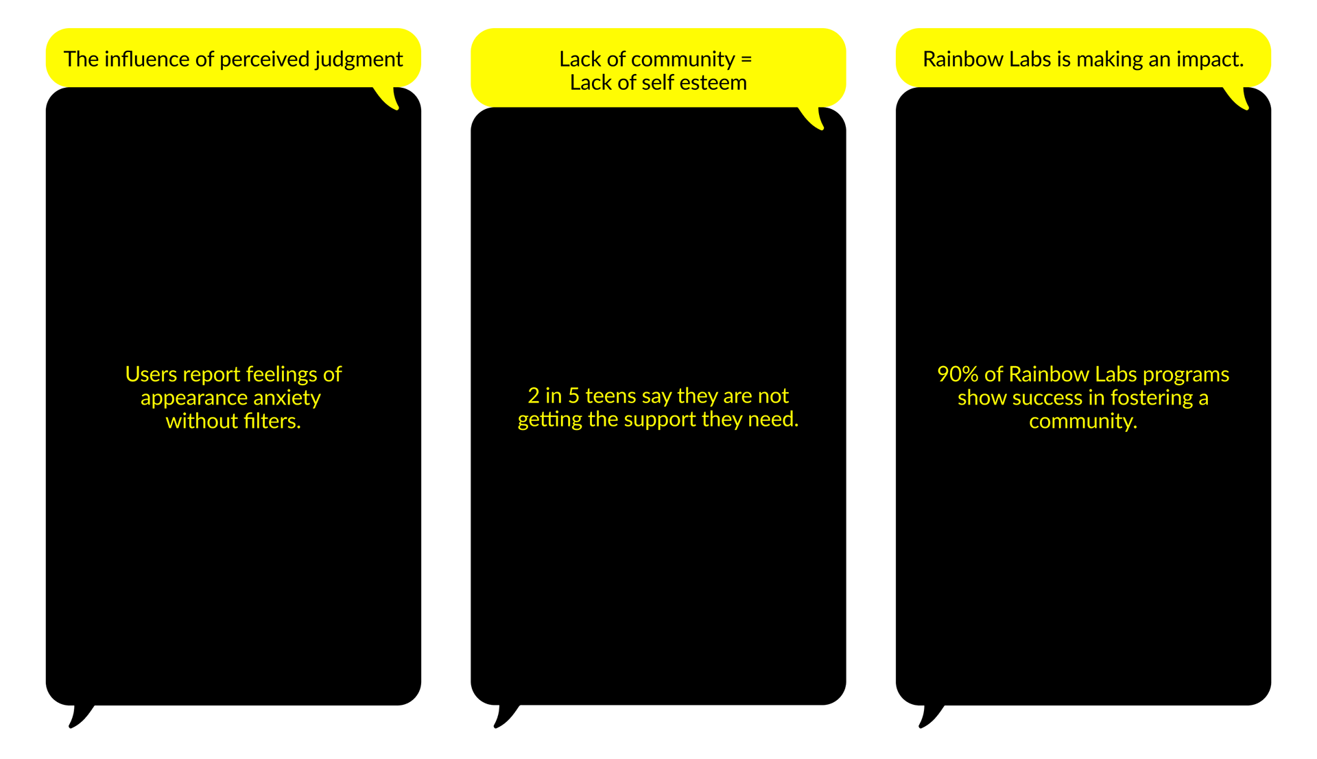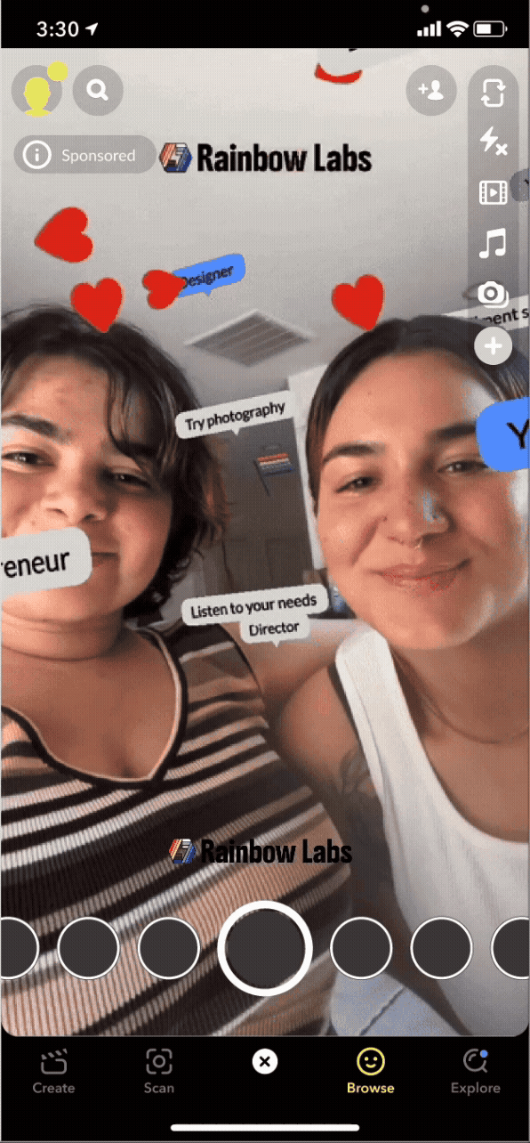 Currently, Rainbow Labs is facing low enrollment for both mentors and youth, so they turned to Snapchat to boost recruitment. The goal is to create a Lens that invites users to emotionally connect with the program and feel encouraged to learn more about Rainbow Labs. The hope is that the Lens makes youth feel seen and encouraged to reach out to the organization to find community. For mentors, we hope they resonate with the youth from their own personal experience and feel inspired to help the next generation.